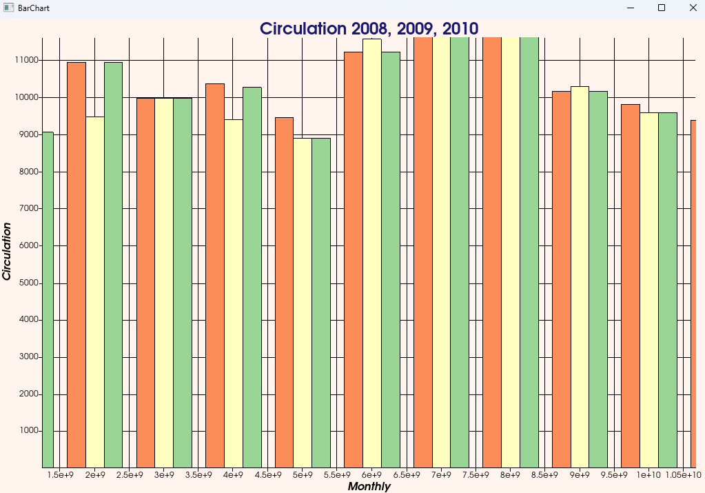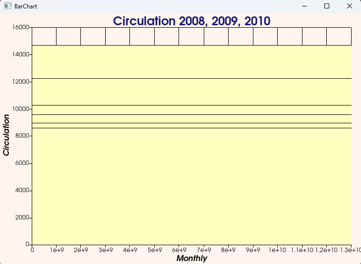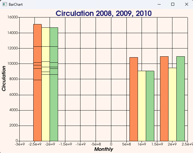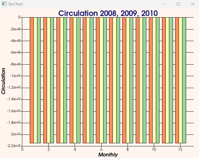 I am trying to create bar charts and I have found that once you reach large enough numbers for either the x axis (bin ranges) or the y axis (bin sizes), the chart no longer shows up as expected. To test this, you can edit this bar chart example from vtk so that each of the data_2008, data_2009, and data_2010 arrays hold doubles instead and then multiple each number within the arrays by 10e5. Likewise, you can edit the x axis values by multiplying each number by 10e8. Below I’ve included some images showing the original bar chart vs the chart using the edited values to show what I mean. Can someone explain why this is happening?