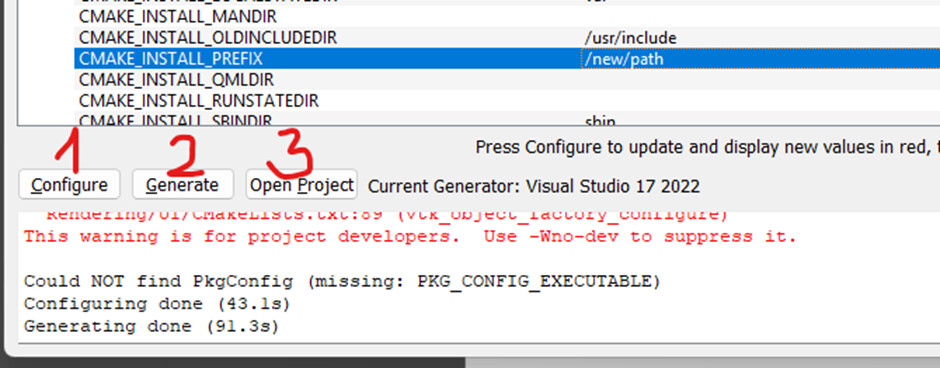 After changing any configuration value in CMake, you need to regenerate it in order to have an updated VS solution file. Doing a make install is enough if you’re using plain Makefiles, but we’re talking about Microsoft technology here. I wouldn’t be surprised if by building only the INSTALL target fails to incorporate the update. Close VS, change it, regenerate, open the solution in VS, build INSTALL and see what happens. If the binaries go to where you wanted, then it’s ok.