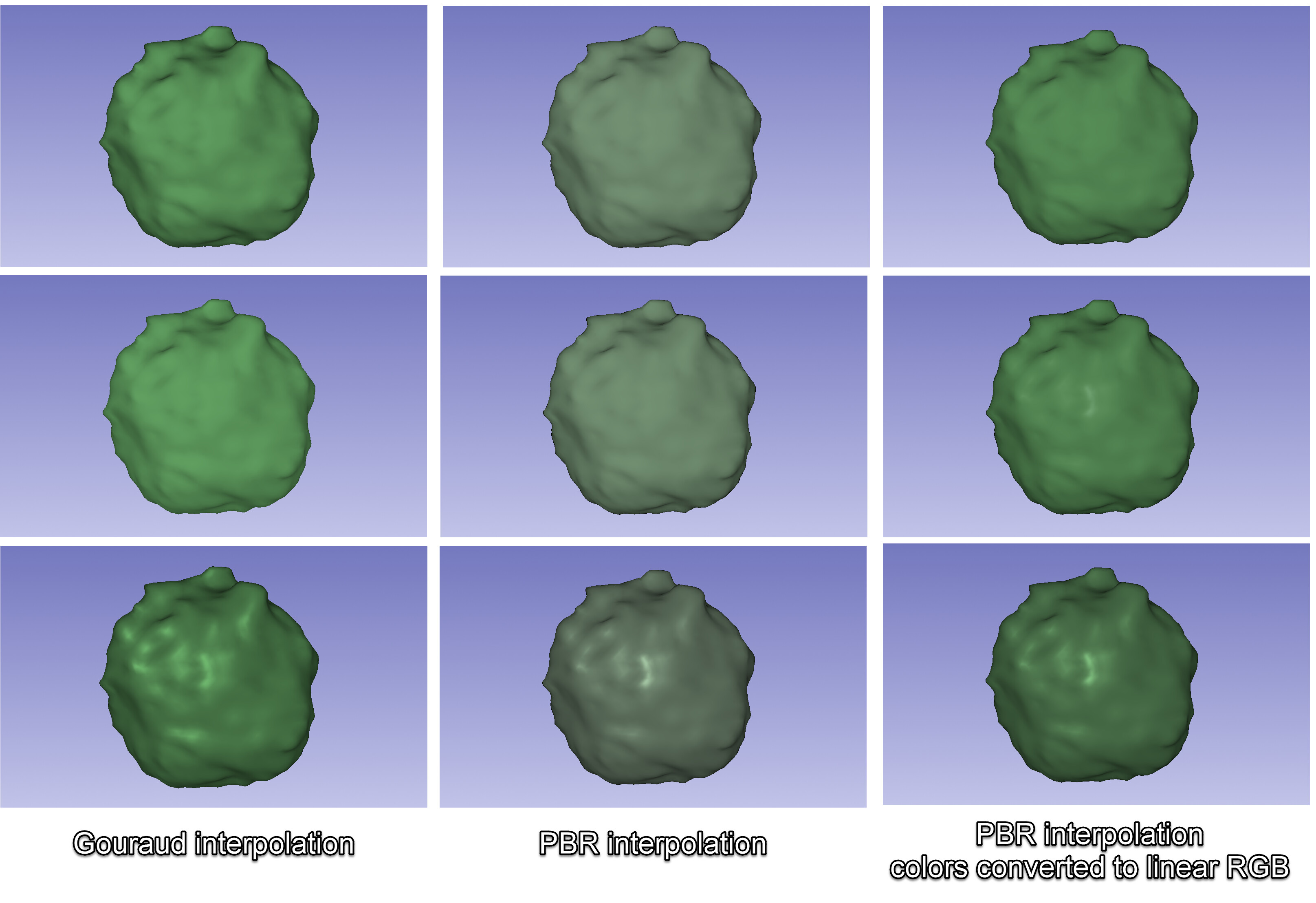 We see incorrect, washed-out colors in the 3D rendering if we change Interpolation to PBR in vtkProperty. For example, the image below shows that if we use the same RGB values with Gouraud interpolation (first column) and PBR interpolation (second column) then with PBR the color looks faded. After converting the RGB values from sRGB to linear RGB (third column), the PBR rendering is no longer faded.
