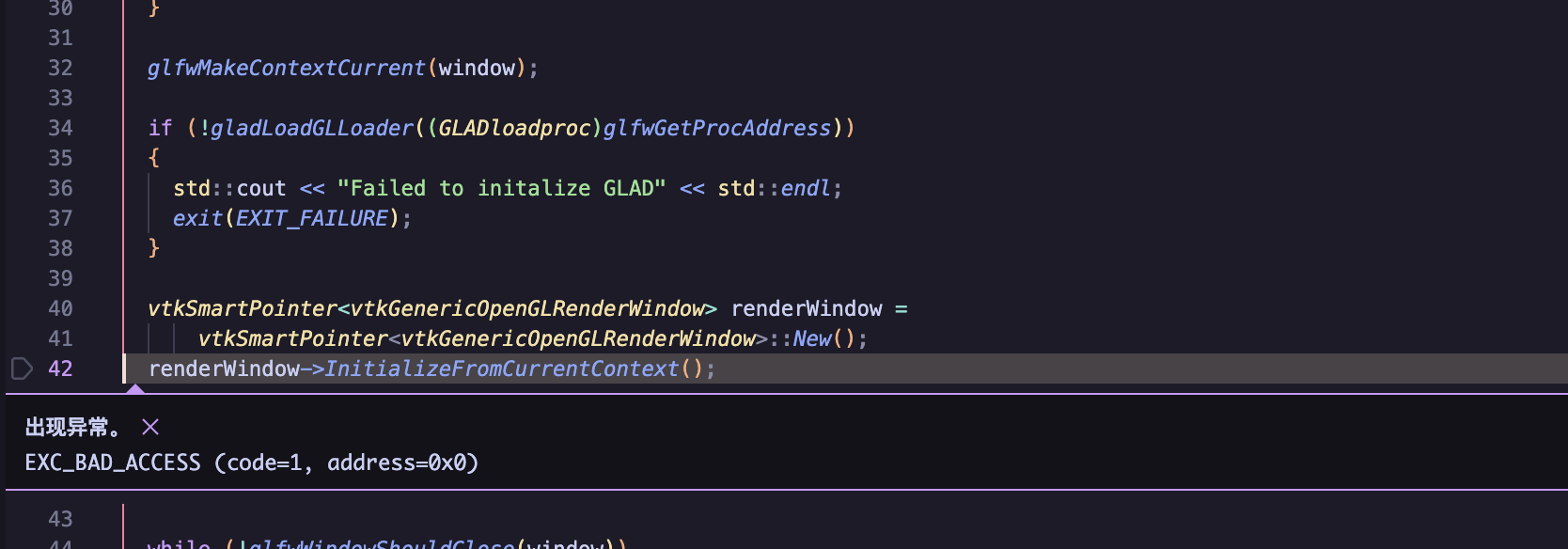 Synchronize the context of the window, but it always throws an error on this function. I tested it on the Windows platform using mingw and it ran normally, but it got an error on my mac,What caused this and how can I solve it。