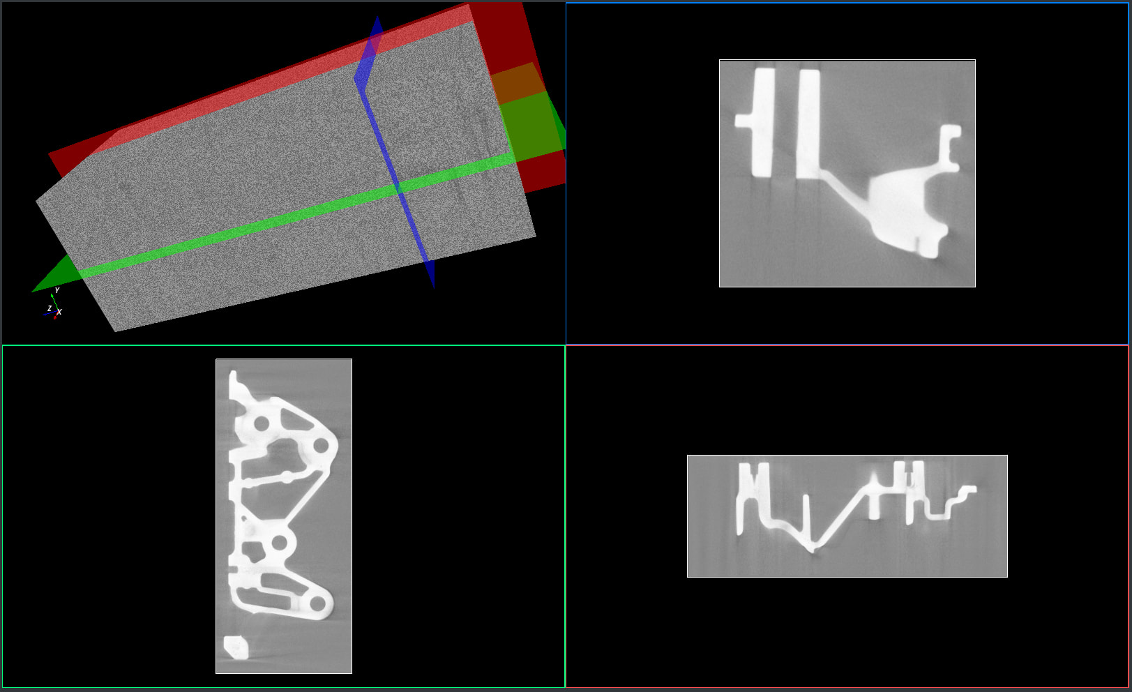 It uses Qt for the UI but the core is what you are hoping to do i.e. 4 different render windows → three 2D slices and one 3D orthogonal planes view.