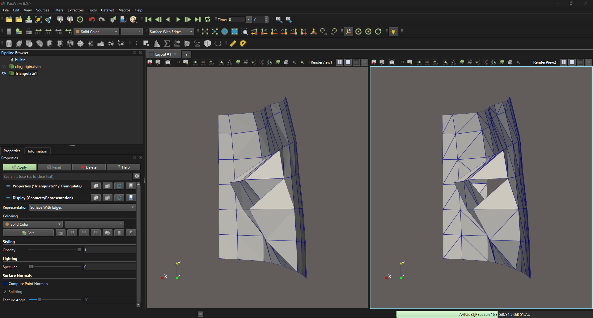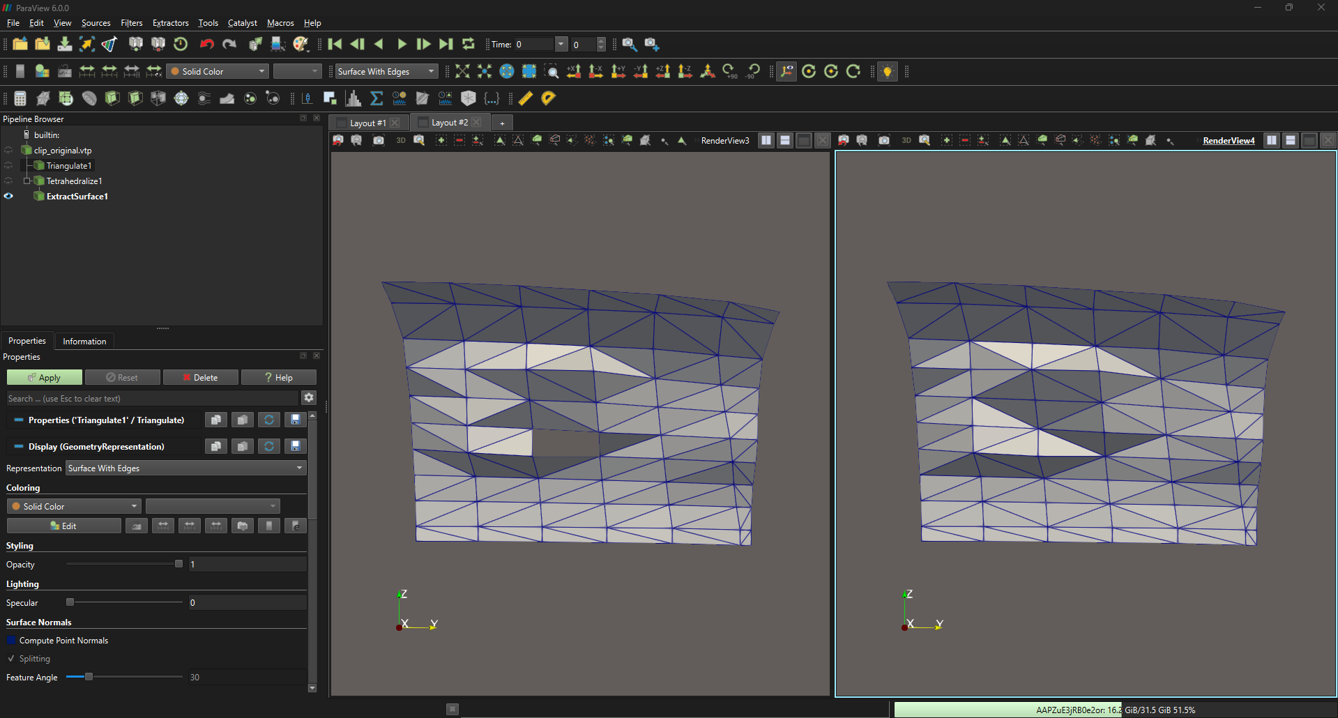 For comparison, when I tetrahedralize it, then extract the surface, no hole appears: (left is post triangulation, right is tetrahedralize → extract surface)