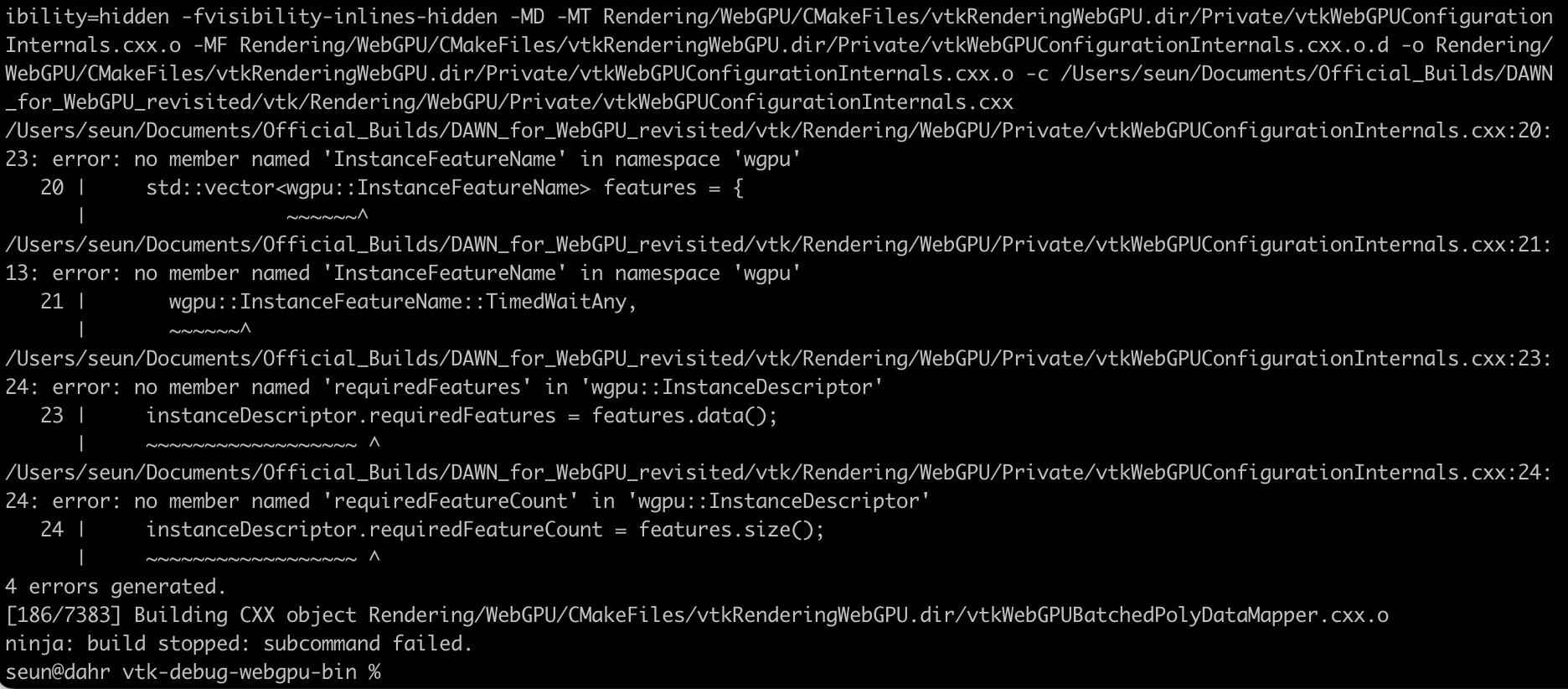 Hello everyone, I would appreciate it if someone could help with this. I have been trying to follow the following tutorial to no avail. https://docs.vtk.org/en/latest/modules/vtk-modules/Rendering/WebGPU/README.html#configuring-and-building-vtk