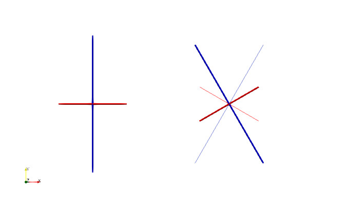 In the image below, the diagonal tensor [1, 2, 3] (left) and its version rotated counterclockwise by π/6 about the z axis (right) are shown. The externally computed correct orientation is the thick line; the orientation returned by vtkTensorPrincipalInvariants is the thin line and appears incorrect.